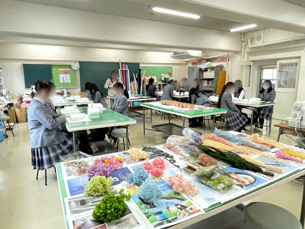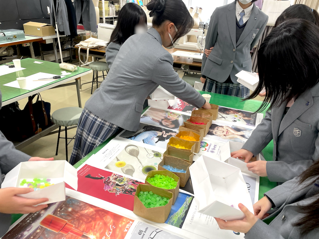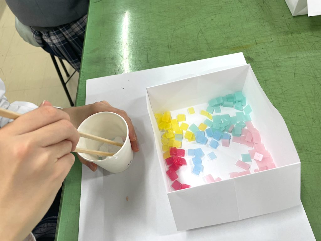 また、モザイクキャンドルでは10色のタイル状のロウを紙コップに敷き詰め、ステンドグラスのように美しいキャンドルを作りました。好きな色でまとめる生徒、全色を使って仕上げる生徒など工夫もさまざまで、どちらも素晴らしい作品となりました。