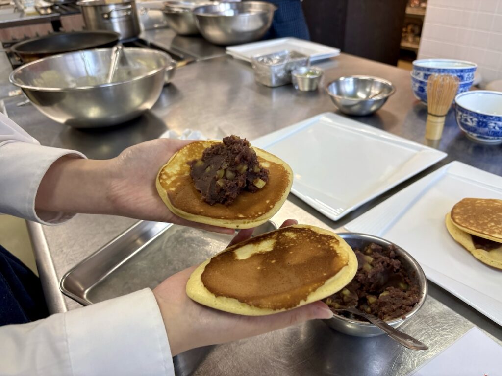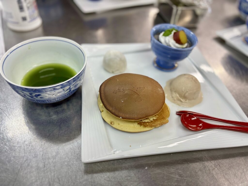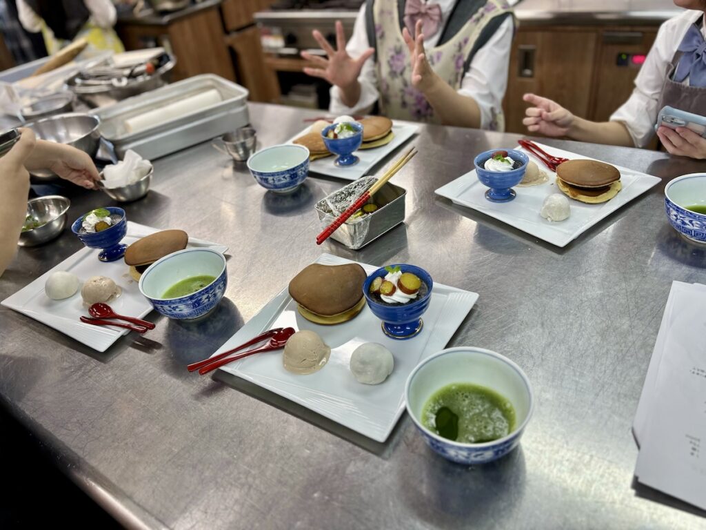 メニューは「栗大福」「どら焼き」「黒ごまプリン」の三種類です。お茶を点てることにも挑戦しました。講師の先生方に丁寧に作り方を教えていただきながら、生徒同士で声を掛け合い、和気あいあいと楽しく作ることができました。