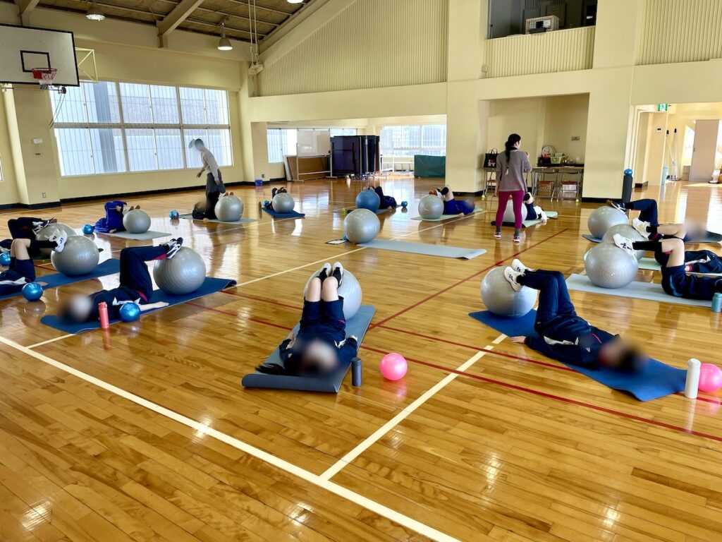 当日は、バランスボールやエアボールなどを使ってストレッチを行いました。呼吸と動作を合わせて姿勢を安定させ、普段は意識しにくい筋肉や体幹をじっくりと鍛えることができました。