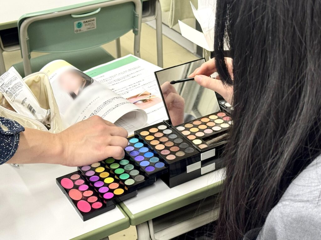 メイクの基礎知識を学んだ後、好きな色を3色選び、グラデーションになるようにアイメイクを実践しました。さらに、涙袋の描き方も教えていただき、実際に試しながら楽しく技術を身につけることができました。