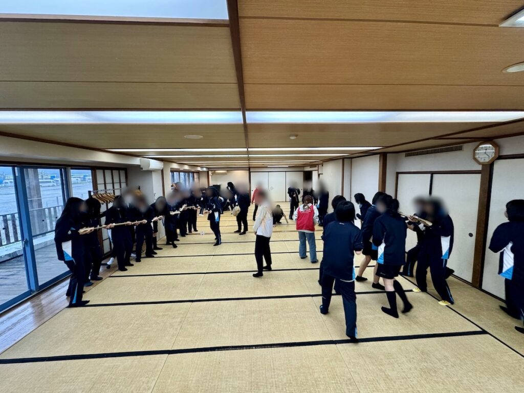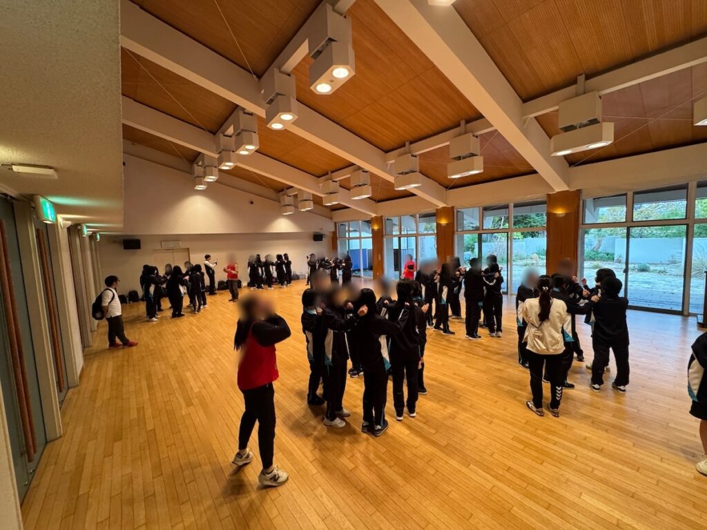 学校からはバスで移動し、到着後、まずはチームビルディングを行いました。あいにくの天候のため屋内での実施となりましたが、自己紹介をはじめ、グループで取り組むアクティビティやチーム対抗ゲームを通して、少しずつ打ち解けた様子が見られました。